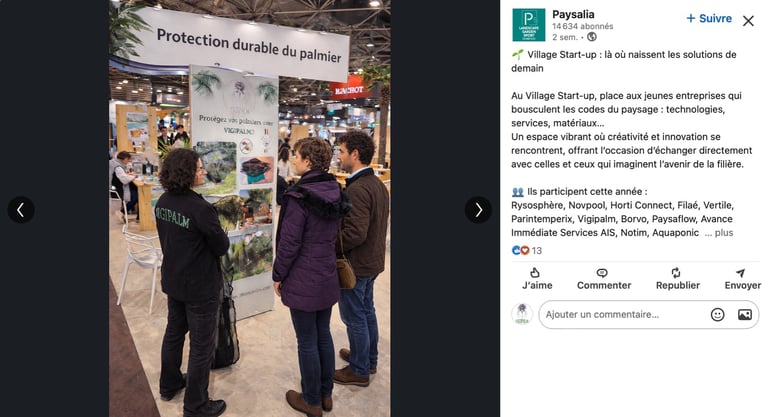 Lors du salon Paysalia à Eurexpo Lyon, Vigipalm® a présenté sa solution brevetée de protection des palmiers au Village Start-Up. Face à la progression du papillon du palmier (et du charançon rouge), la solution a suscité un fort intérêt auprès des professionnels en quête de dispositifs à la fois efficaces, responsables et simples à mettre en œuvre. Cette participation représente une étape stratégique pour le développement de Vigipalm et ouvre des perspectives de collaborations en France et à l’international, dans un contexte où les solutions écologiques deviennent prioritaires.