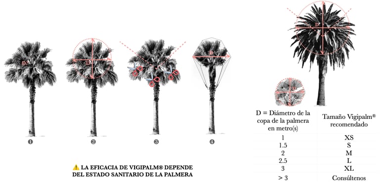 La corona de palmas forma un círculo representado en rosa a continuación. Para una palmera sana, mide el diámetro D, que equivale al ancho máximo de este círculo. Si la palmera presenta síntomas de infestación y/o ha sido sometida a una poda sanitaria previa, el diámetro de este círculo será menor. Para palmeras de gran altura, marca en el suelo los extremos de la corona y luego mide la distancia entre estos puntos para evaluar el diámetro. Después, elige el tamaño de la malla adecuado según lo siguiente: